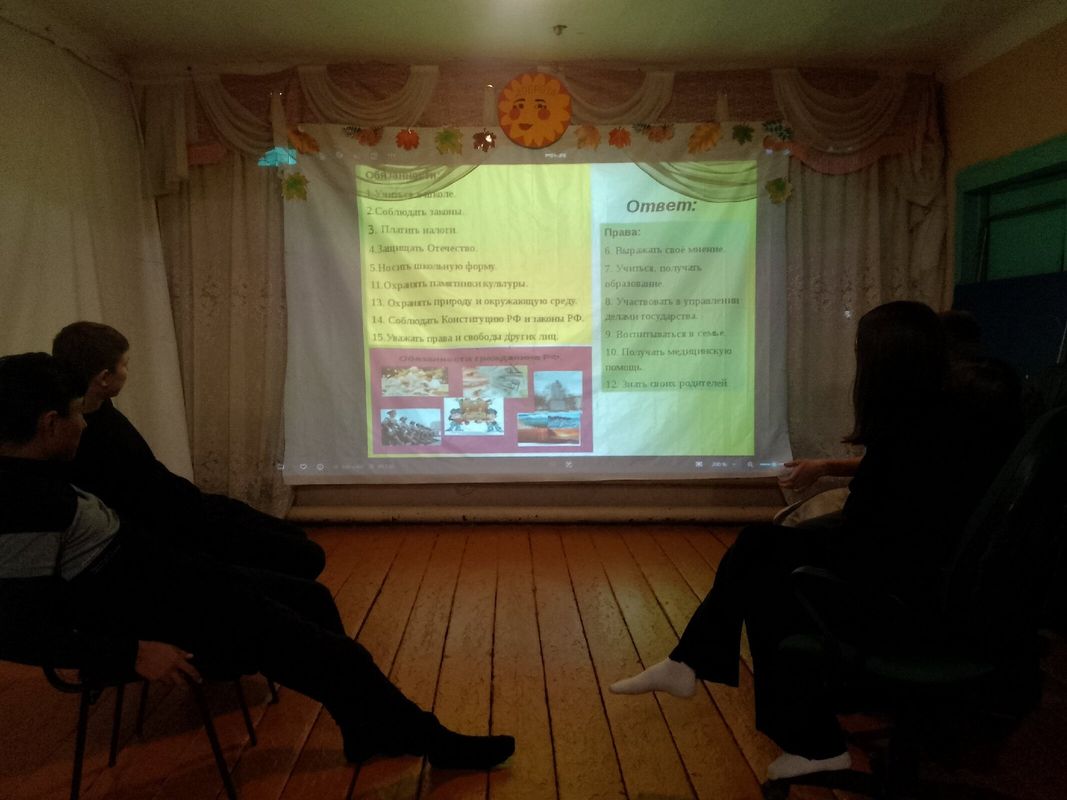 В ходе мероприятия организатор мероприятия напомнила о том, что такое закон и по каким законам живут граждане России. Это Конституция РФ, Конвенция о правах ребёнка, Семейный, Гражданский, Трудовой и Уголовный кодексы. Согласно этим документам, россияне, в том числе и школьники, имеют права и обязанности. С большим удовольствием подростки приняли участие в рассмотрении понятий «проступок», «правонарушение» и «преступление», а также в рассмотрении различных ситуаций, связанных с нарушением закона. Участники мероприятия узнали о своих главных правах: на жизнь, на имя, на воспитание в семье. Подростки приняли участие в викторине, решали крассворд. Подростки внимательно слушали, с удовольствием задавали вопросы и обсуждали различные ситуации.
